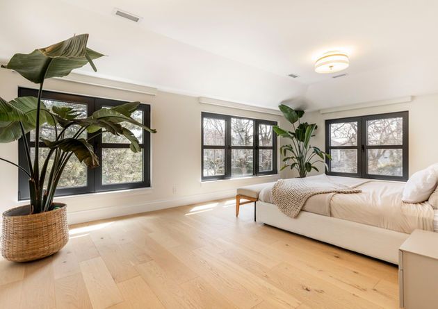 À l’étage, la suite principale a été conçue comme un espace intime et ressourçant. Sa salle de bain, baignée de lumière grâce à de larges fenêtres, juxtapose le marbre lumineux à des armoires aux teintes profondes, ponctuées de détails dorés. La baignoire autoportante, positionnée comme un élément sculptural, invite à la détente, tandis que la coiffeuse intégrée témoigne d’une attention portée au confort quotidien.